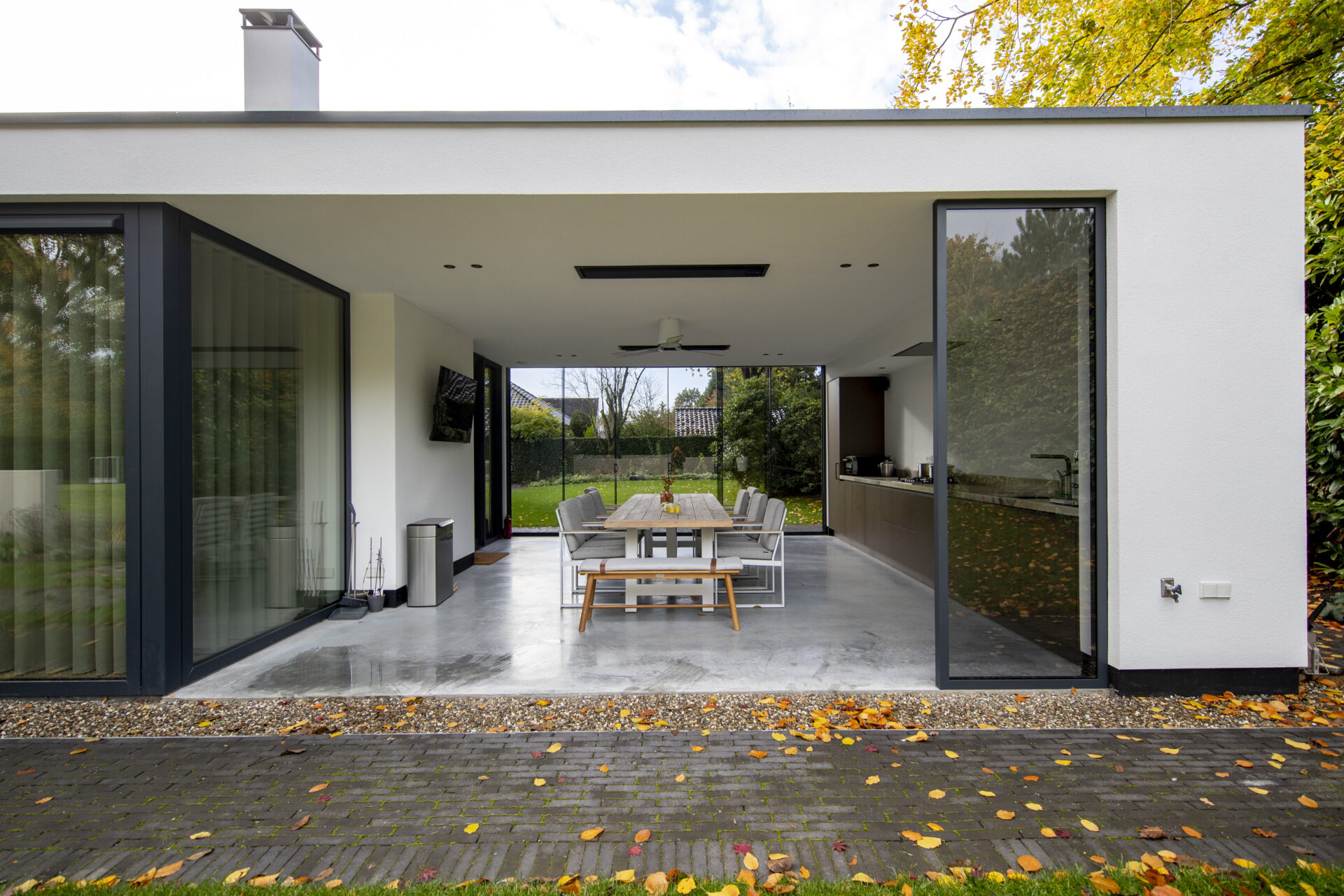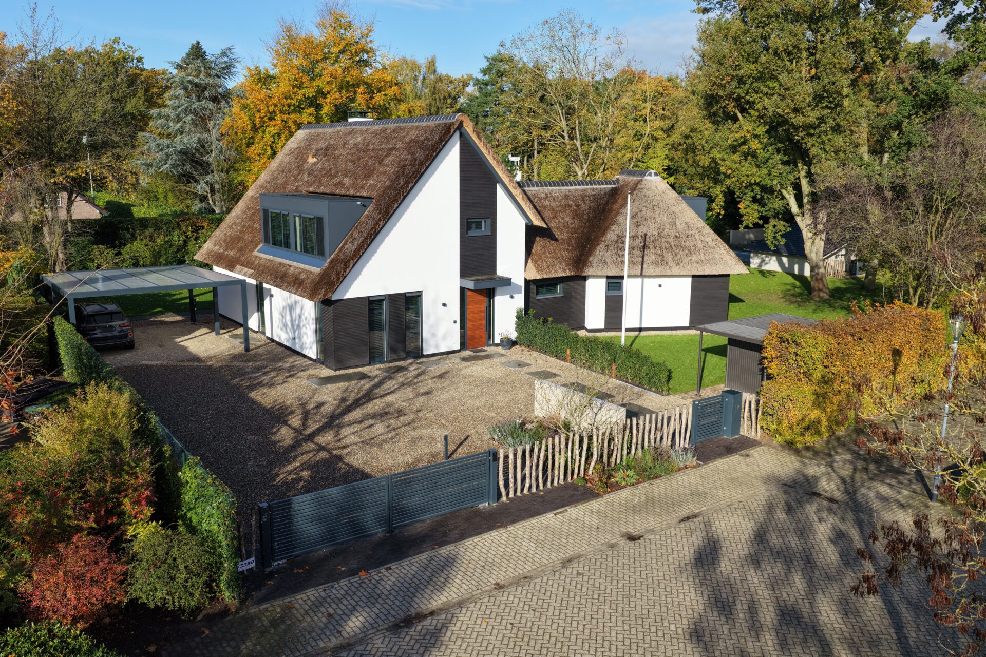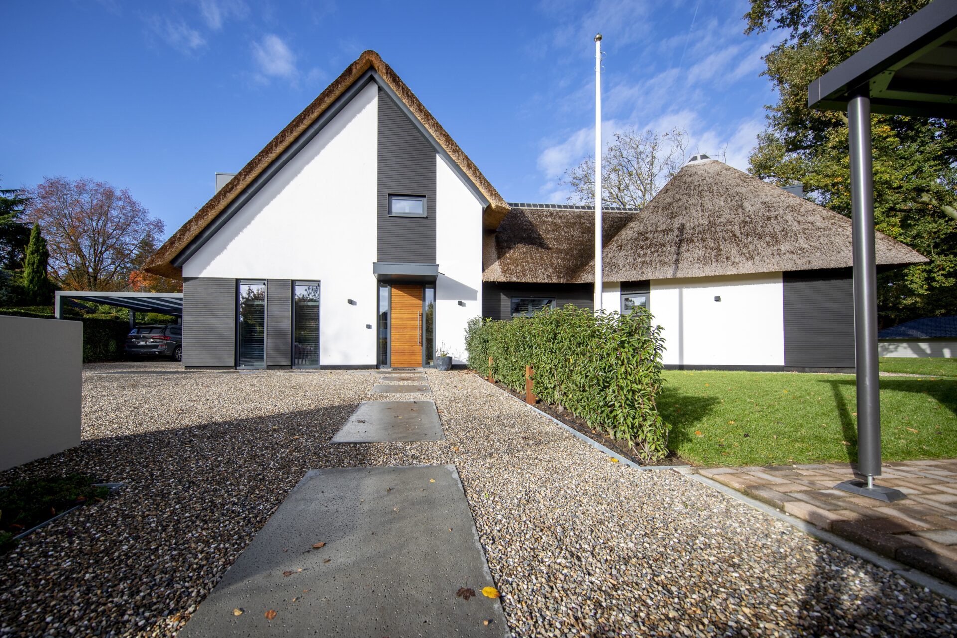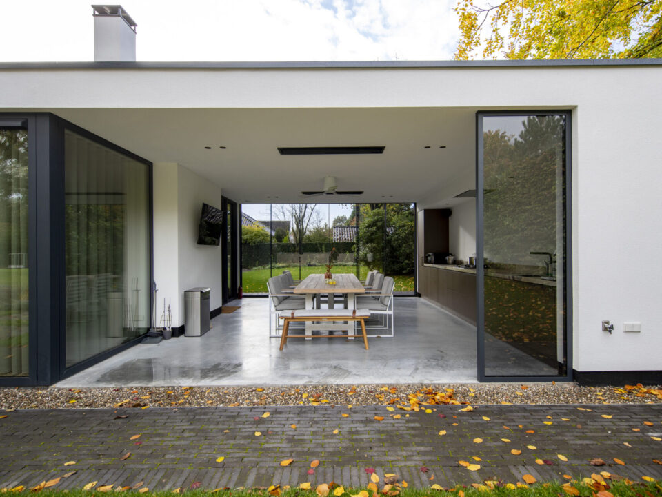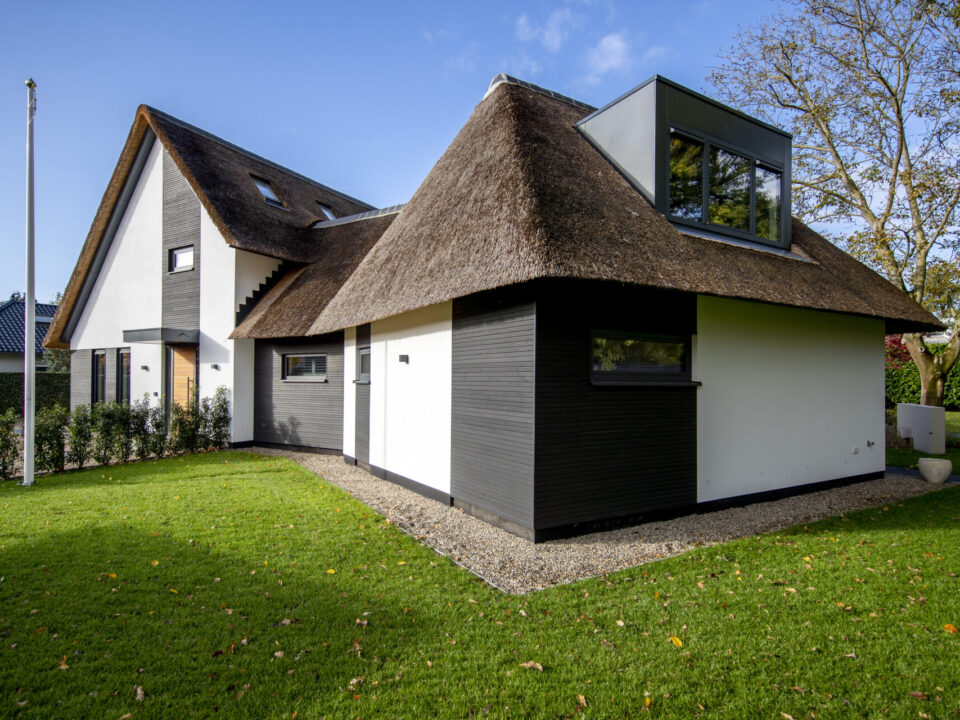 Bij deze verbouwing combineerden we modern en landelijk wonen. De woning kreeg een nieuwe uitstraling met een rieten kap, strak stucwerk en duurzame aluminium kozijnen. De aanbouw met glazen wanden verbindt binnen en buiten en zorgt voor een lichte, open leefruimte.